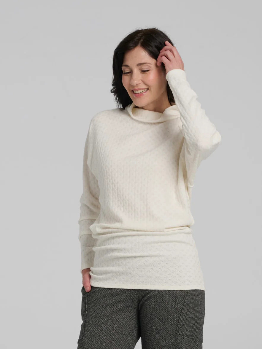 Avec Loom, on découvre le plaisir d’une tunique qui enveloppe le corps comme un doux cocon, tout en laissant la liberté de bouger avec fluidité. Offerte en deux étoffes au charme distinct — le blanc torsadé d’une douceur infinie et le taupe texturé au toucher duveteux — elle s’adapte aux envies et aux saisons. Son col délicatement posé autour du cou invite à la détente, tandis que ses manches raglan et sa coupe qui se resserre aux poignets et au bas permettent de jouer avec la silhouette : blousante pour un volume aérien ou étirée pour mettre en valeur sa longueur flatteuse. Sur un legging, un pantalon ou même seule pour les plus audacieuses, Loom devient vite cette pièce qui accompagne aussi bien les journées actives que les moments de calme.