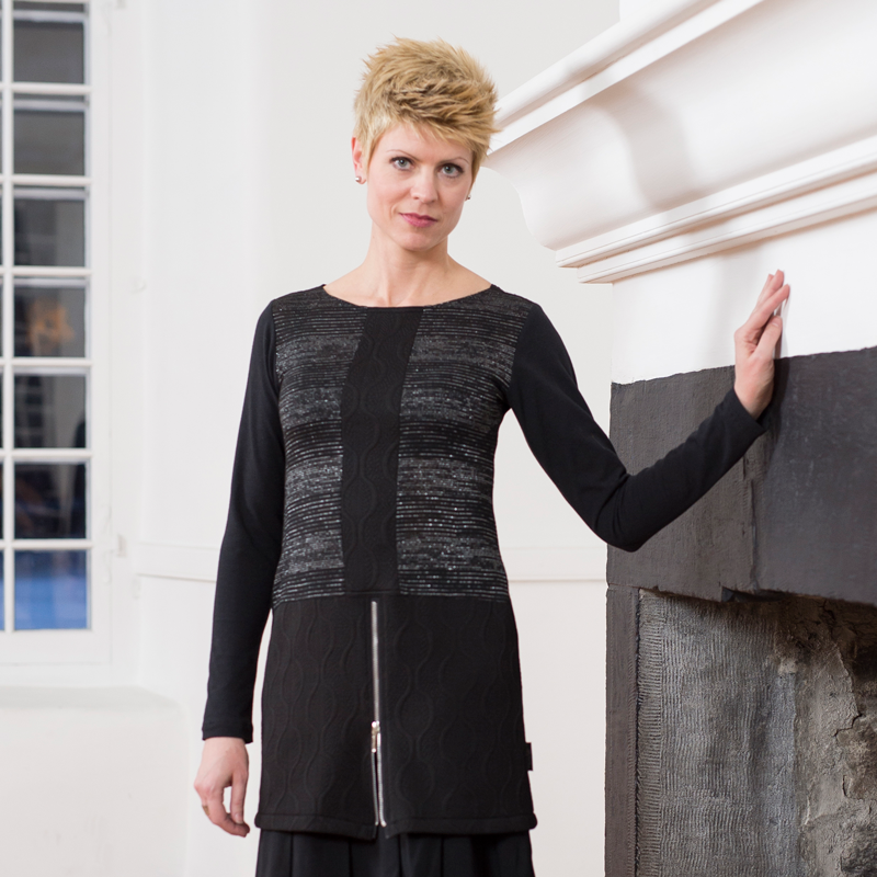 Cette tunique se distingue par son tissu ligné texturé à l'effet presque scintillant et sa fermeture éclair dans le bas. Il est intéressant de la porter fermeture éclair ouverte ou fermée, de la porter avec un skinny confort noir et faux-cuir, un legging long noir uni, un jeans ou une jupe.