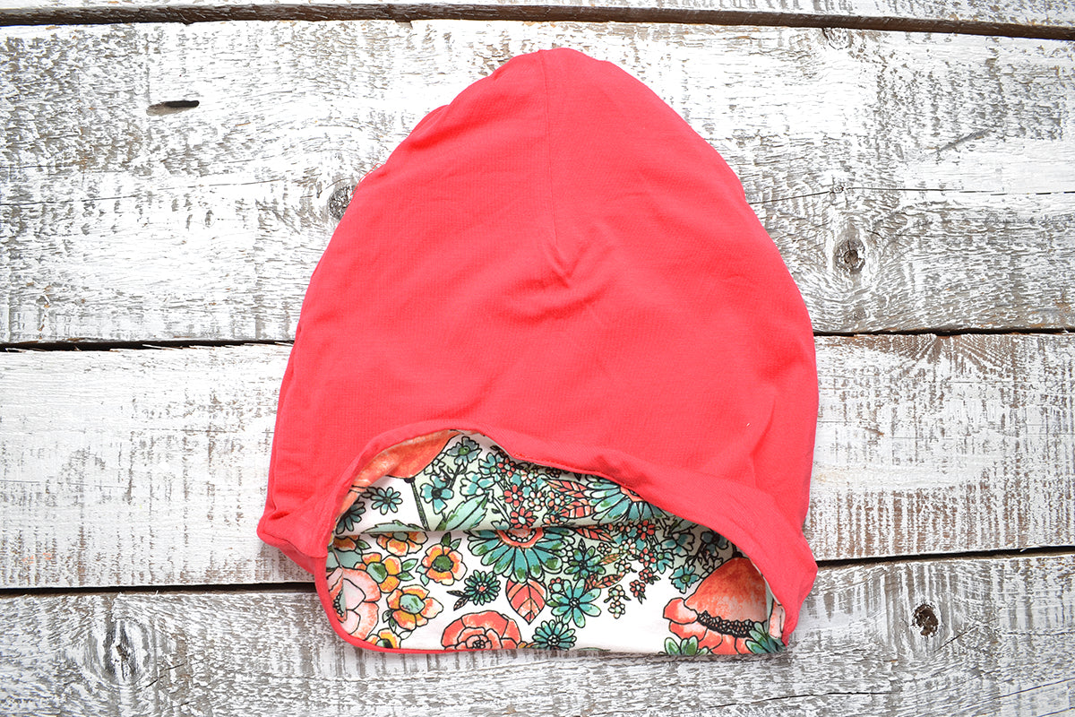 Tuque réversible en coton fleurie et bambou corail, 100 % coton et 95% bambou, 5% spandex.