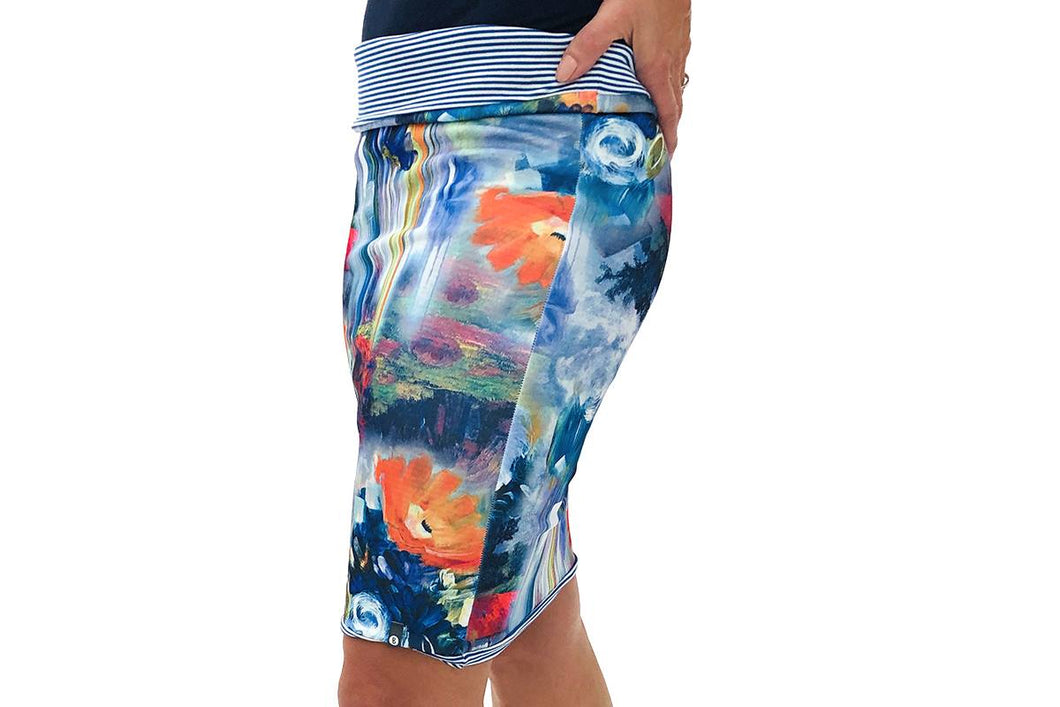 Tube à motif d'une peinture avec fleurs et trait allongé dans les teintes de bleus, violets, verts et oranges et de l'autre coté, rayé blanc et bleu. Il est réversible et se porte de 3 façons : jupe, top et foulard!