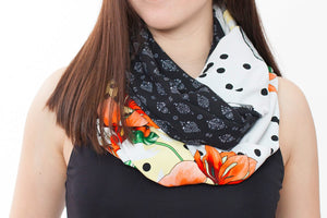 Foulard infini d'un à motif de fleurs oranges, noires et blanches accompagné de pois noir et de feuilles verts et de l'autre côté un motif noir et blanc de mandala en pointillisme.