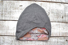 Tuque réversible en coton fleurie et bambou gris, 100 % coton et 95% bambou, 5% spandex.