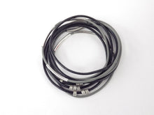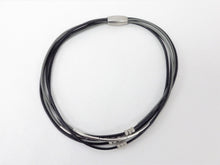 Ce collier choker à cordons de cuir se transforme en bracelet double lorsque plié en deux. L'attache est aimantée, facile à mettre et tient bien en place. Les pièces en acier inoxydable ne sont pas fixe et peuvent glisser aisément sur les cordons, vous permettant de les placer comme bon vous semble!