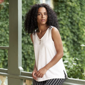 Pour un look naturel et très élégant, optez pour cette camisole ligne A faite de chanvre et coton biologique. Encolure en V, 3 boutons décoratifs, fente sur les côtés, pas trop transparente, elle a tout pour devenir votre haut coquille préféré!