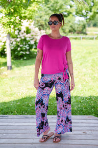 Au bas, les possibilités sont infinies! La couleur magenta forme un couple parfait avec notre palazo rumba paisley, notre jupe-cuissard pop marguerites bleu, notre jupe 7/8 madison rayé gris & blanc, notre jupe-legging Éva noir, nos jupes cigogne noir et dancehall, notre palazo charleston noir et notre palazo rumba noir. Ceux-ci ne sont que quelques exemples des mille et une combinaisons possibles!