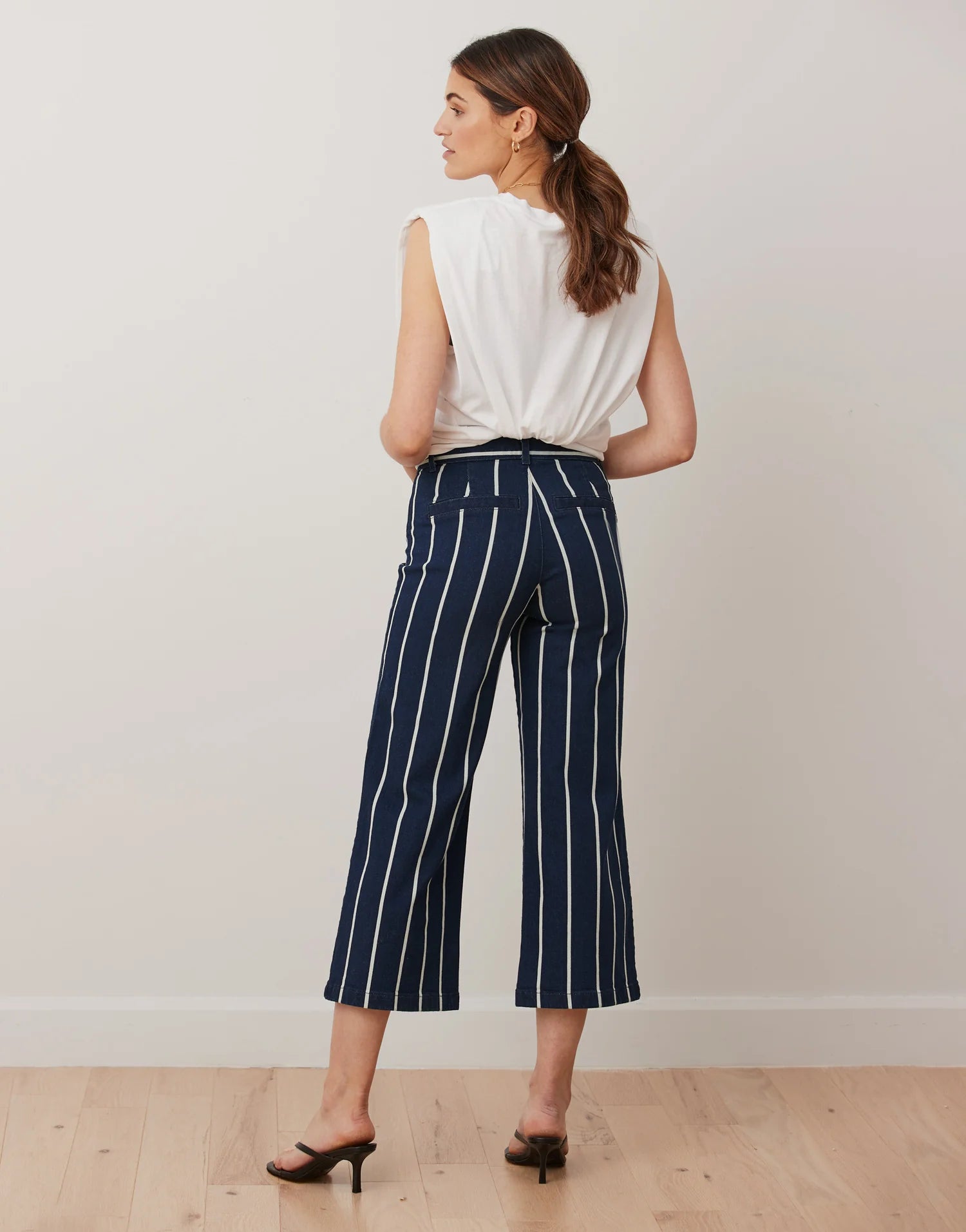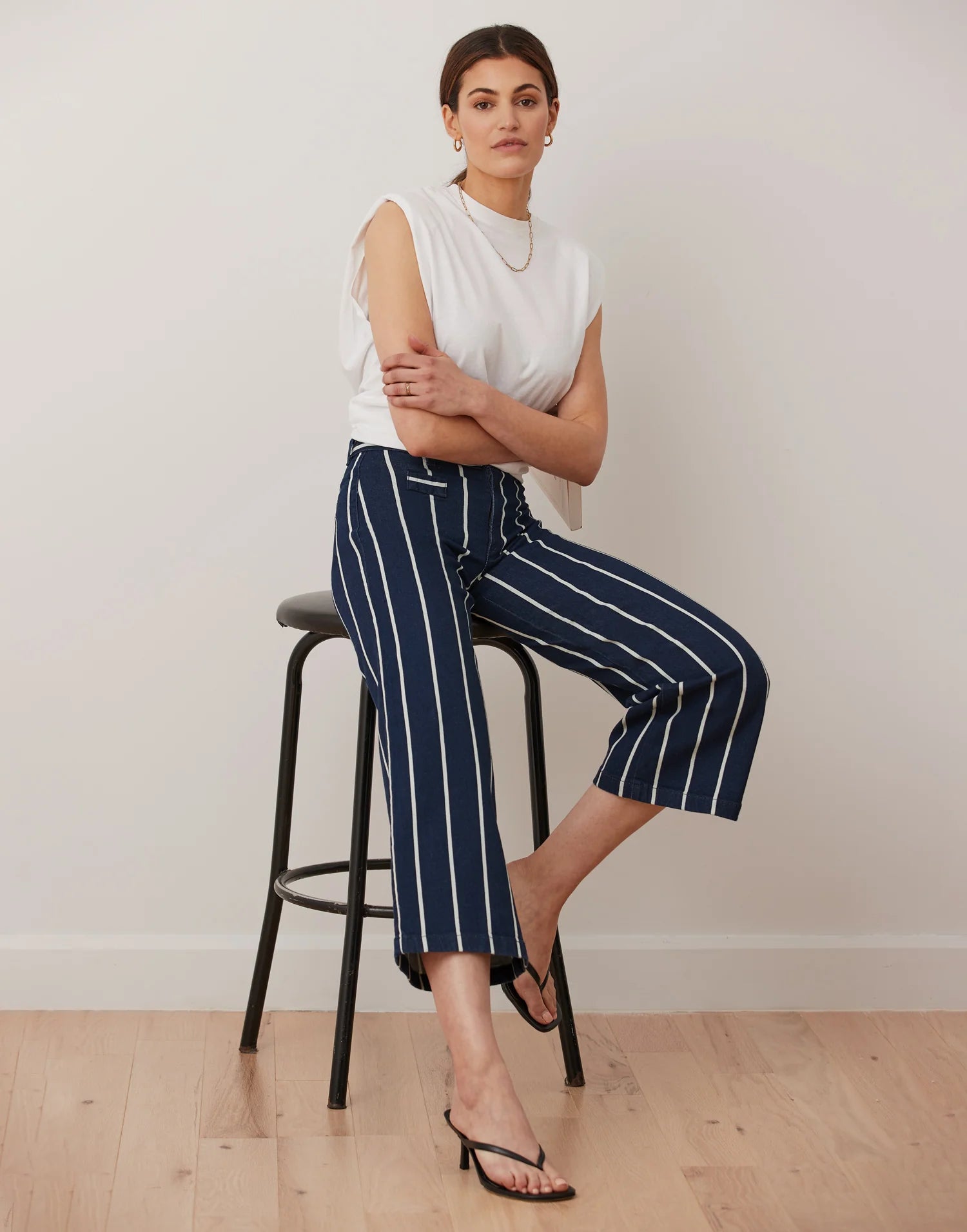Ce modèle très évasé à taille classique a un entrejambe de 25", soit notre nouvelle longueur écourtée à la cheville. Il a de fausses poches de type chino et est fait d’un tissu recouvert de mini-rayures.