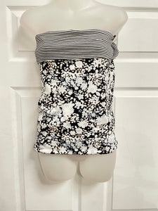 Ce tube foulard en bambou est rayé noir et blanc d'un côté et coloré de bandes bleues, roses corail, noires et blanches s'entremêlant de l'autre. Il est réversible et se porte de 3 façons : jupe, top et foulard!