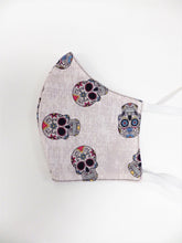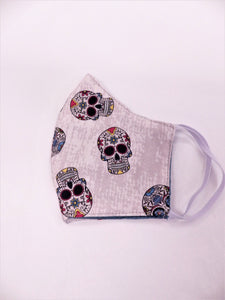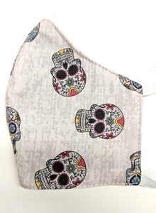 Masque non médical créé au Québec par Rouge Canapé. Blanc & têtes de mort mexicaines