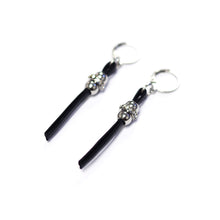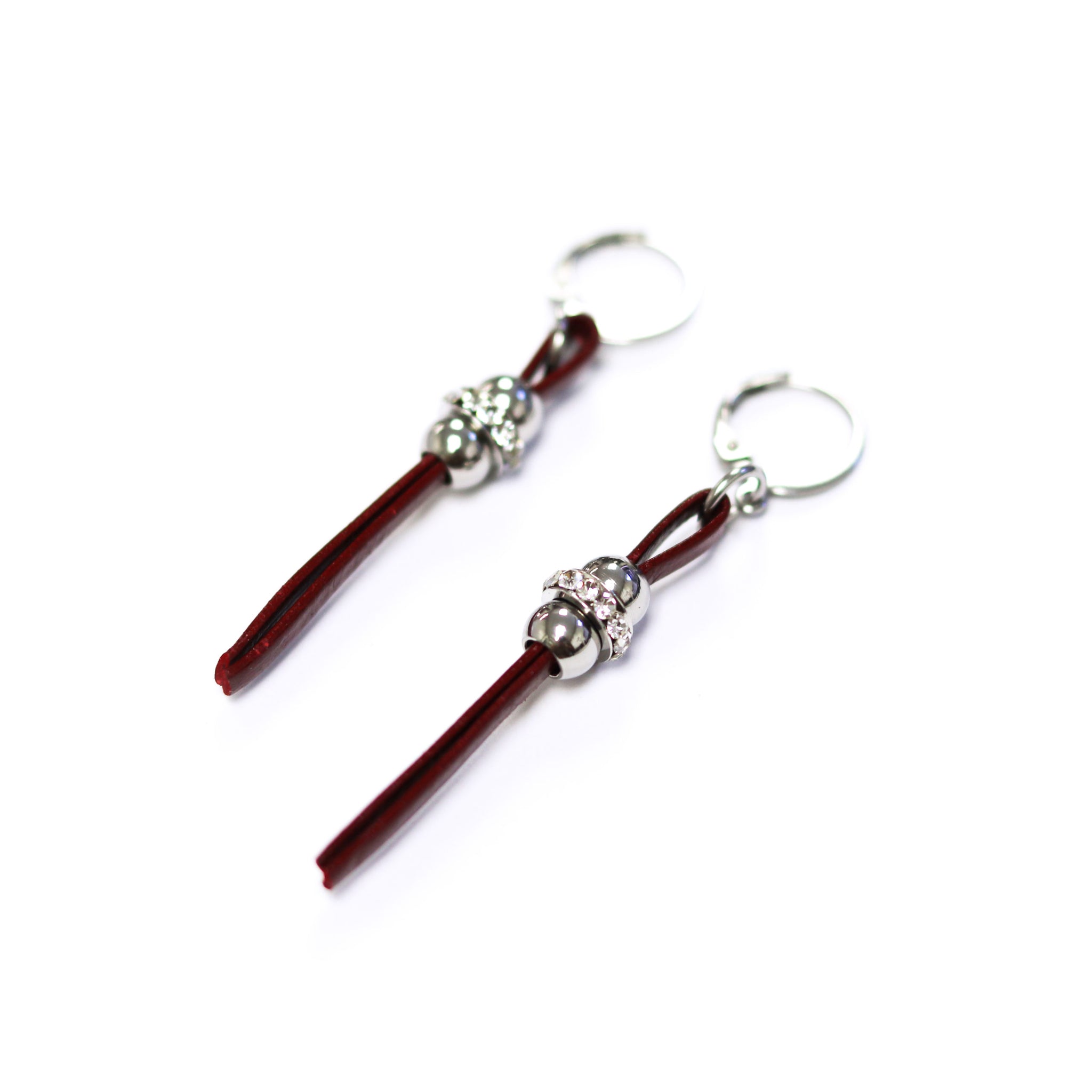 Les boucles d’oreilles Luxury sont composées de lanières de cuirs de 5 cm de long, des billes en acier inoxydable ainsi qu’une magnifique rondelle de cristaux de Swarovski.