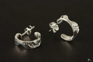 Voici les boucles d'oreilles ANNEAUX fixes en argent sterling .925 conçues avec une texture distinctive fabriquée à partir d'une empreinte d'un coquillage d'oursin de mer.
