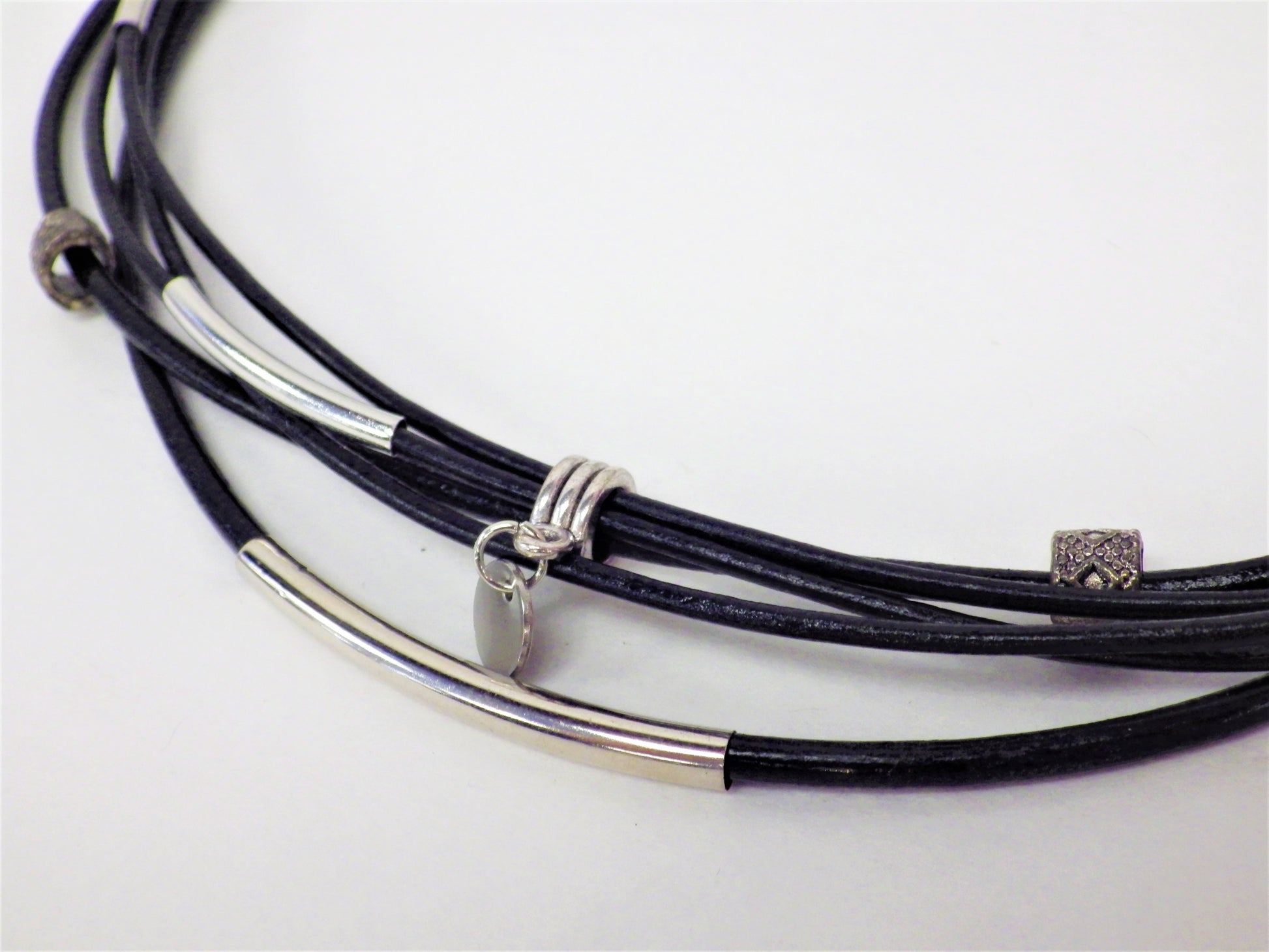 Ce collier choker à cordons de cuir se transforme en bracelet double lorsque plié en deux. L'attache est aimantée, facile à mettre et tient bien en place. Les pièces en acier inoxydable ne sont pas fixe et peuvent glisser aisément sur les cordons, vous permettant de les placer comme bon vous semble!