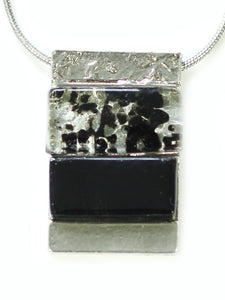 Pendentif d’étain orné de verre avec ou sans pièce de bois sur chaîne en acier inoxydable.