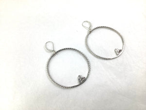 Voici les moyennes boucles d'oreilles ANNEAUX PENDANTS en argent sterling .925 conçues avec un fil lisse et torsadé. Le tout agencé à un petit coeur empreint d'une texture d'un coquillage d'oursin de mer. L'anneau qui accueille le coeur est mobile.