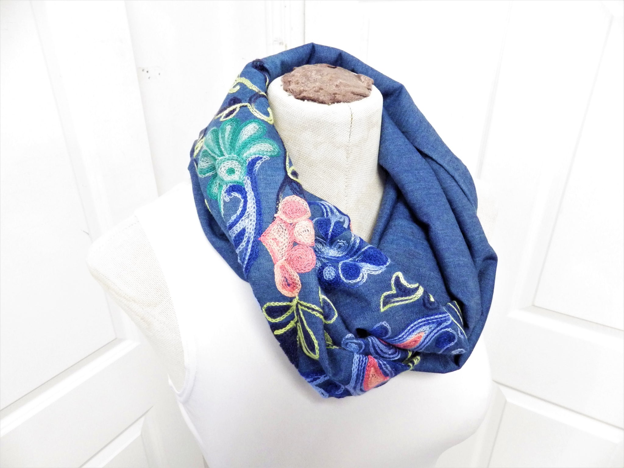 Foulard infini en jeans avec broderies fleuris.