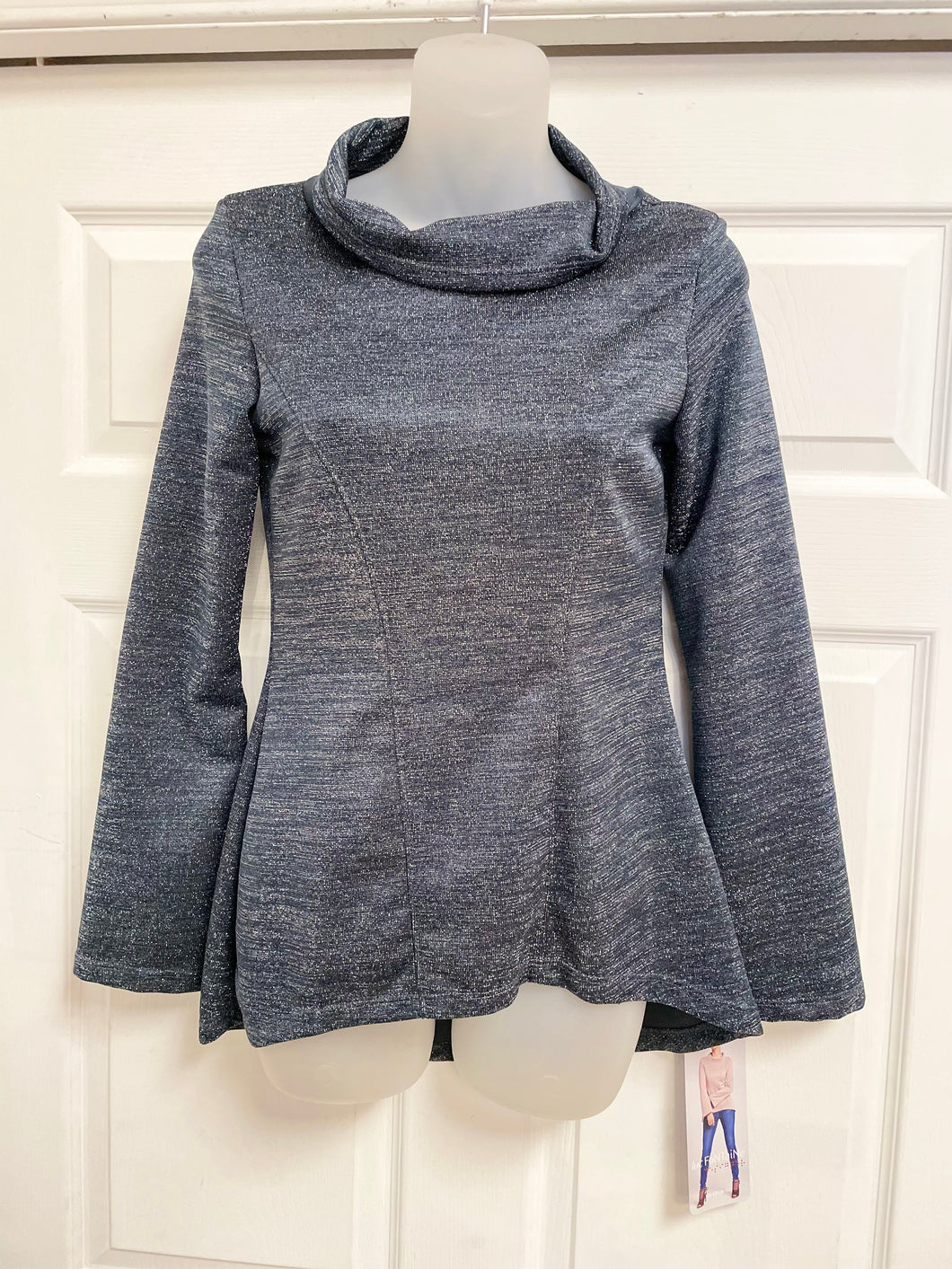 Bleu acier avec fils argent légèrement scintillants, Coupe ronde asymétrique plus longue au dos.
